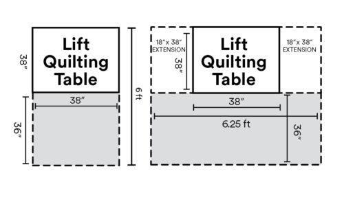 These diagrams show exactly how much space you’ll need. The white area indicates the actual frame footprint, while the grey area shows the extra room you’ll want around the frame so you can move freely as you quilt.