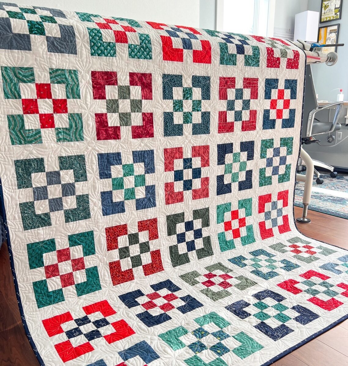 Longarm quilting adds texture and movement, elevating simple patchwork into a striking finished quilt.